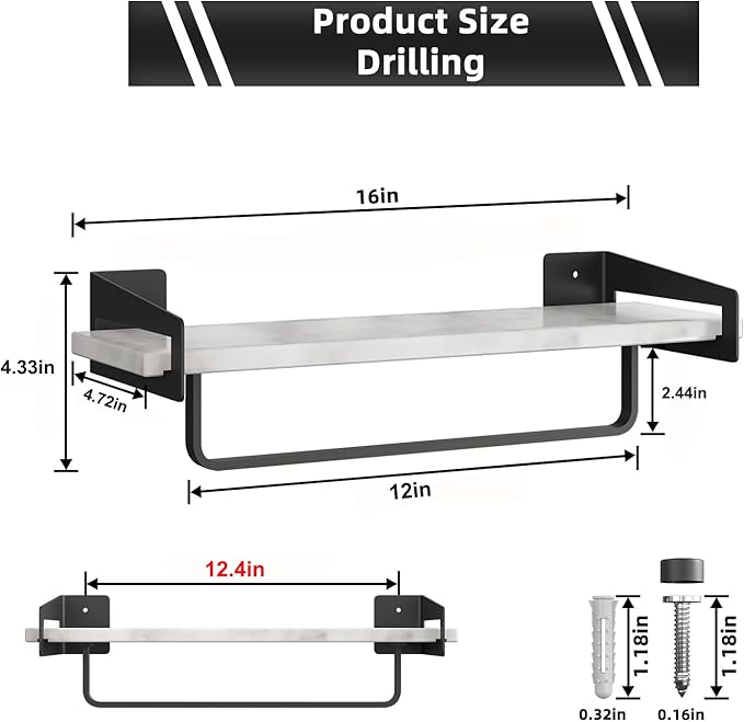 - Perfect Size:The size of marble bathroom wall shelf L x W x H is 16 x 4.72 x 4.33 inches,the towel bar length is 12 inches.A small shelf completes a large storage in the bathroom