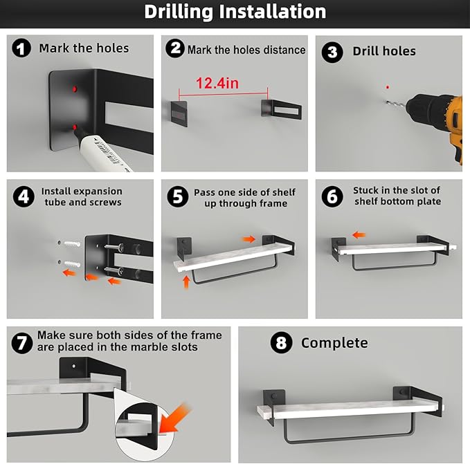 - Simple Installation:The marble bathroom shelf bottom has a card slot non-slip snap design,which is free removal, Convenient for cleaning and changing positions,Installation package including screws and anchors for easy setup