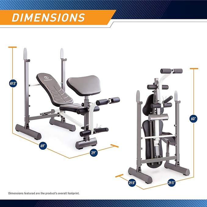 - FULL BODY WORKOUT – The Marcy Folding Standard Weight Bench offers a full body workout so you can chisel your body the way you want it. Get a balanced physique by training with the weight bench’s arm curl facets, back and seat pads or the leg developer.