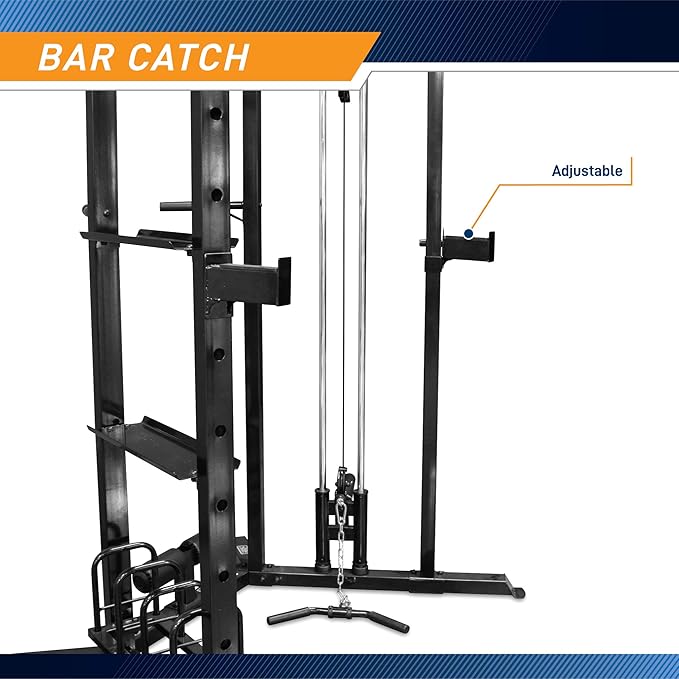 - ADJUSTABLE STYLE BAR CATCHES – This strength cage is designed with an adjustable, commercial-style bar catch so that you can move from bench press to squats easily. This workout machine also has a multi-handle pull up station with wide and narrow grips.